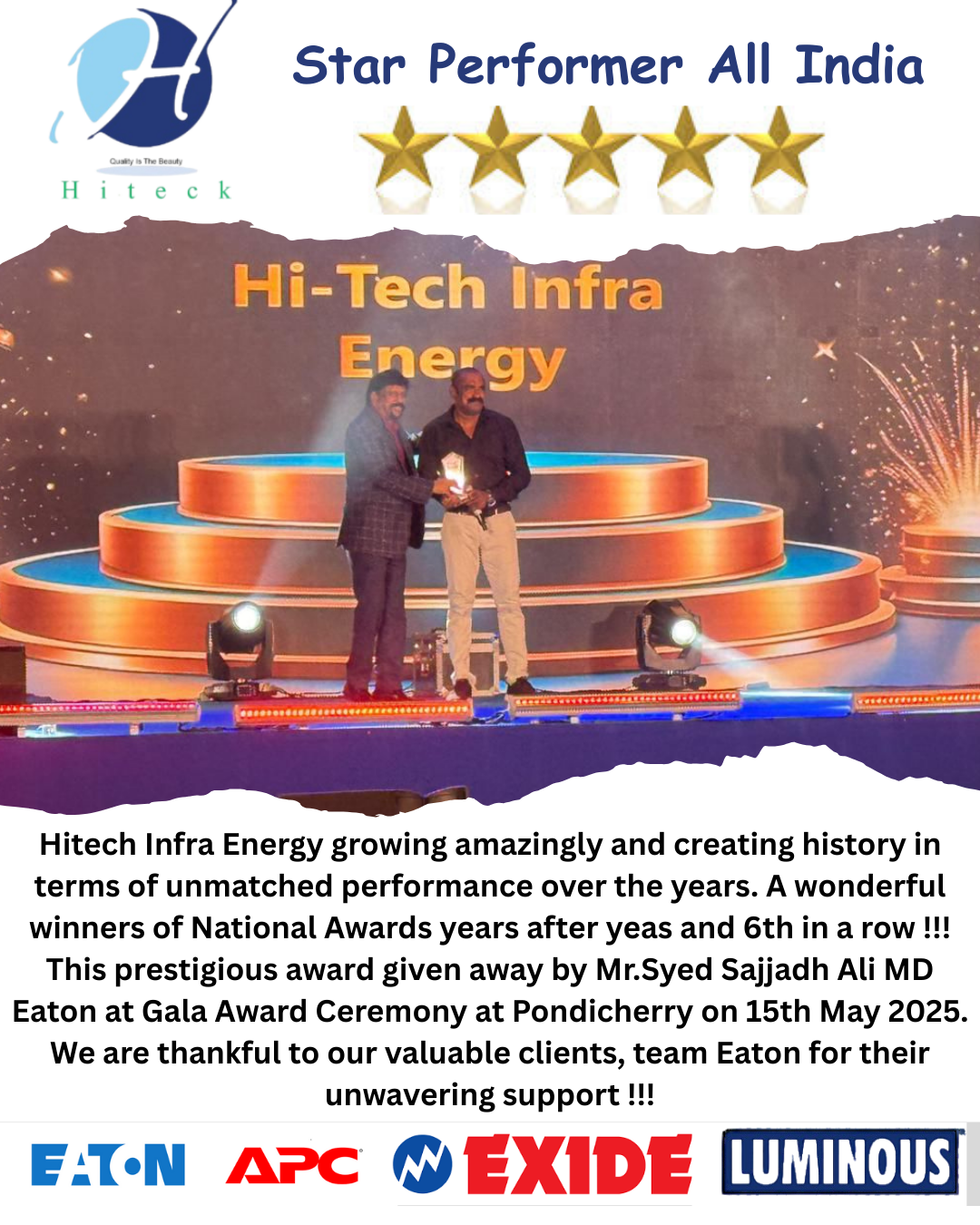 Hiteck Infrenergy is a professional and reliable team. Their UPS systems are high-quality and efficient. They completed our industrial setup perfectly on schedule. We faced zero downtime since installation. Very satisfied with their service and support.